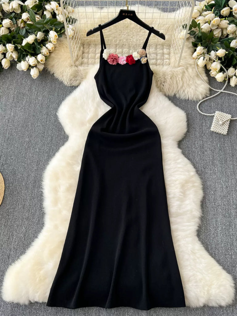 Morph your wardrobe into a gallery of sophistication with this exquisite black evening gown, featuring a unique floral mosaic at the neckline. This dress is the epitome of elegance, tailored to accentuate your silhouette while offering a comfortable fit that moves with grace. The bodice flows seamlessly into a full-length skirt, providing a striking contrast to the vivid bouquet of hand-stitched flowers adorning the straps and chest. This artistic detailing not only captures attention but also beautifully complements the gown’s overall allure, making it an ideal choice for formal events, elegant receptions, or a dramatic theatrical performance. Pair it with minimalist jewelry and a sleek updo to highlight the neckline's artwork and ensure that all eyes remain on you.