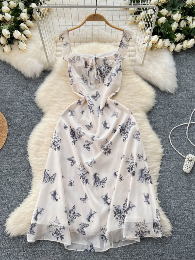 Elegant Ivory Butterfly Print Summer Dress