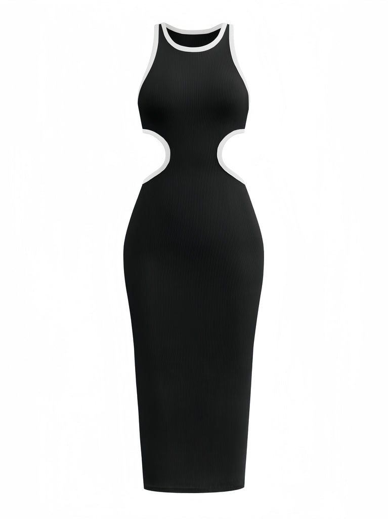 Brilliance in design is what this Breathtaking Elegance Side-Cut Midi Dress stands for! Show off your refined taste in fashion with this sleek and sultry black number that captivates at first glance. Crafted with a form-fitting silhouette, it boasts a ribbed fabric that comfortably hugs your curves, offering a touch of stretch for effortless movement. The unique side-cut details create an intriguing visual contrast, accentuated by crisp white piping that highlights your waist and adds a modern edge. A daring thigh-high slit ensures a dramatic flair with every step, while the round neckline and racerback cut maintain a sophisticated balance. Perfect for cocktail evenings or exclusive parties, this dress is an emblem of contemporary elegance!