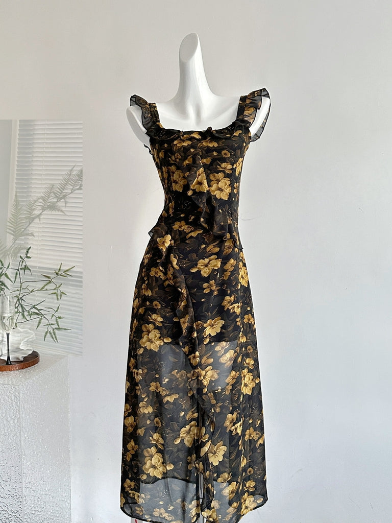 This glamorous black floral midi dress is a captivating blend of sophistication and style. The black fabric serves as a perfect backdrop for the golden floral print, creating a striking contrast. The ruffled square neckline and straps add a touch of femininity, while the asymmetric ruffle cascading down the front enhances the silhouette. Ideal for evening events or upscale gatherings, it exudes an air of elegance that's sure to turn heads.