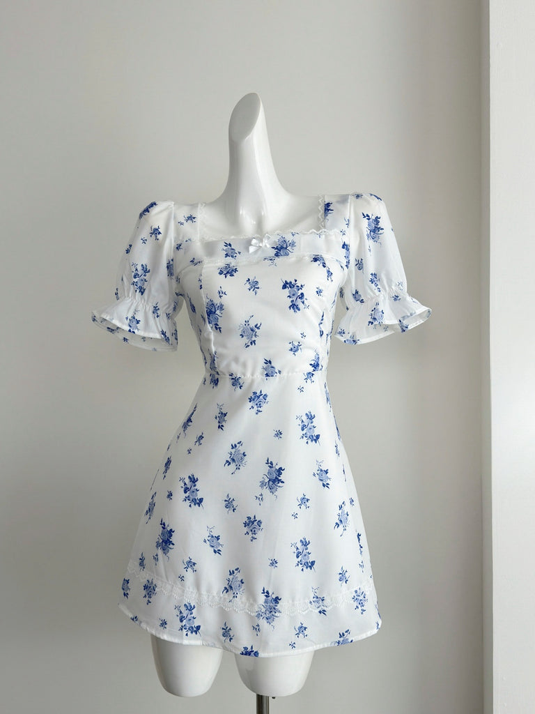 Blue Floral Print Ruffled Trim Short Sleeve Mini Dress