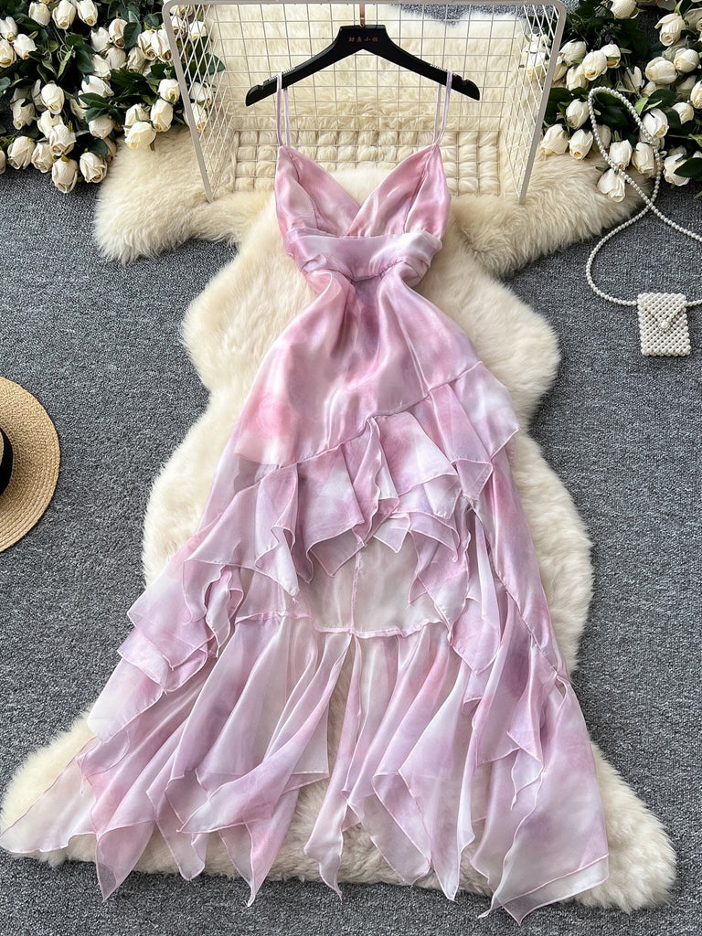 Cascading Ruffled Layers Spaghetti Straps Pink Tie Dye Dress