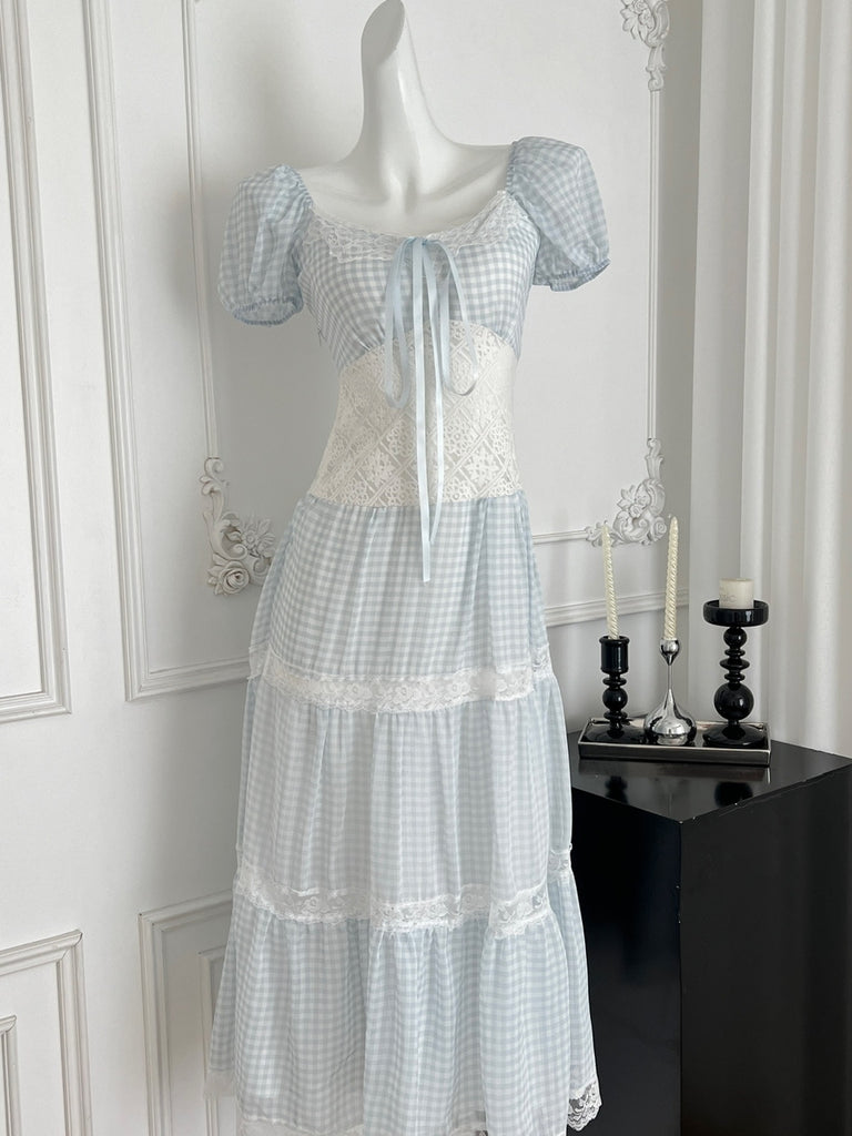 Charming Blue Lace Puff Sleeve Maxi Dress