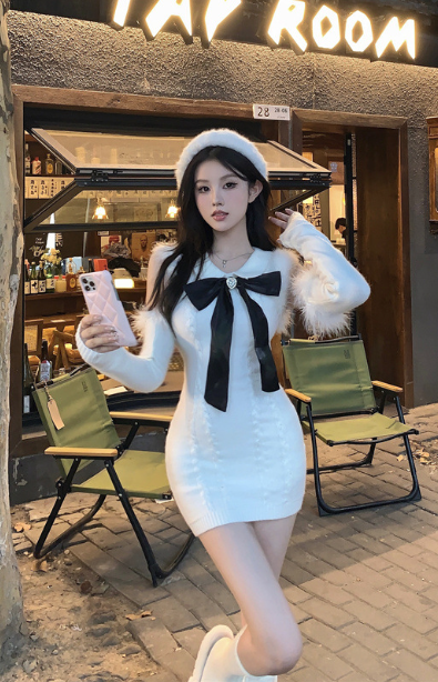 Charming White Knit Dress with Black Bow and Furry Details