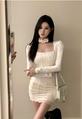 Delicate White Lace Dress with Ruffled Choker and Long Sleeves