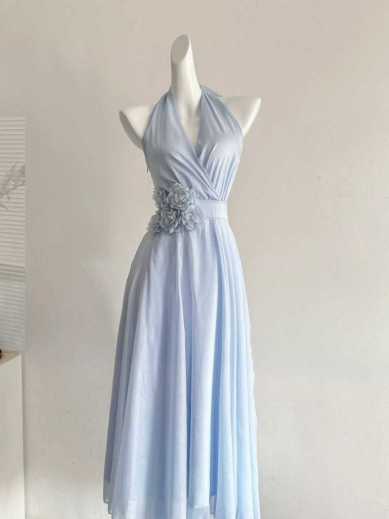 Elegant Light Blue Halter Neck Chiffon Midi Dress