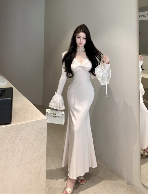 Elegant Long - Sleeve Ivory Mermaid Dress with Lace Cuffs