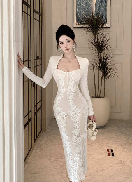 Elegant Long - sleeve White Lace Corset Midi Dress