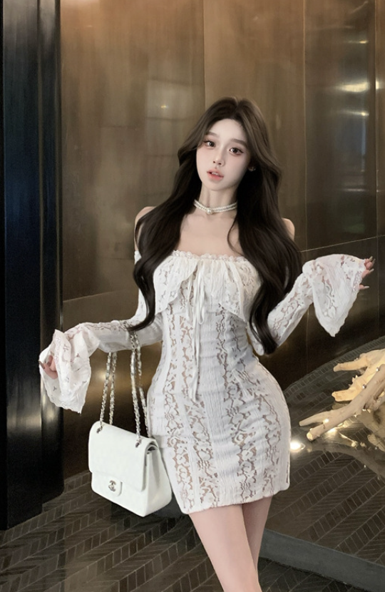 Elegant Off - Shoulder White Dress with Snake Print Lace