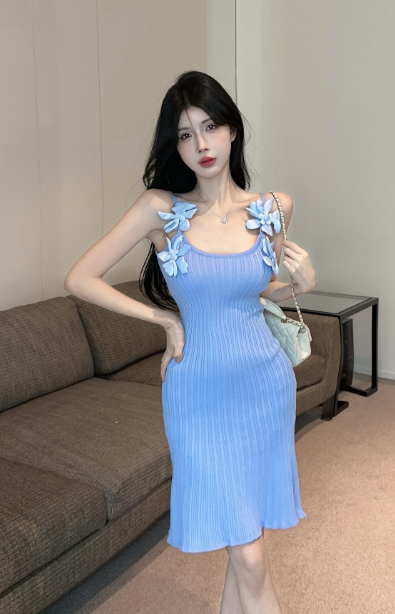 Elegant Ribbed Knit Dress in Blue with Adorable Floral Details