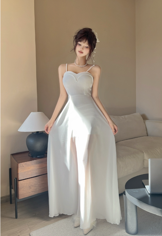 Elegant Sweetheart Neck White Chiffon Spaghetti Strap Maxi Dress