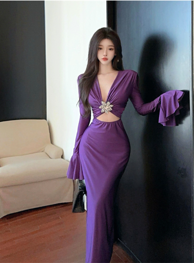 Elegant V - neck Purple Gown with Ruffled Sleeves and Gem Detail