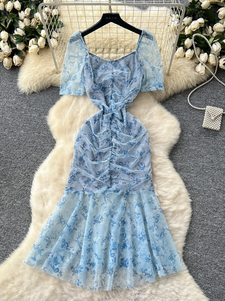 Gallant in design and effortlessly stylish, this blue floral mesh dress is the perfect combination of sweetness and allure. The soft light blue base, adorned with delicate floral patterns, creates a visually harmonious and captivating look. A flattering square neckline enhances the décolletage, while the short mesh sleeves add a playful and feminine charm. The ruched detailing at the waist not only accentuates the figure but also provides a subtle texture that elevates the overall design. A flared skirt at the bottom adds a touch of flirtation, making the dress youthful and dynamic.