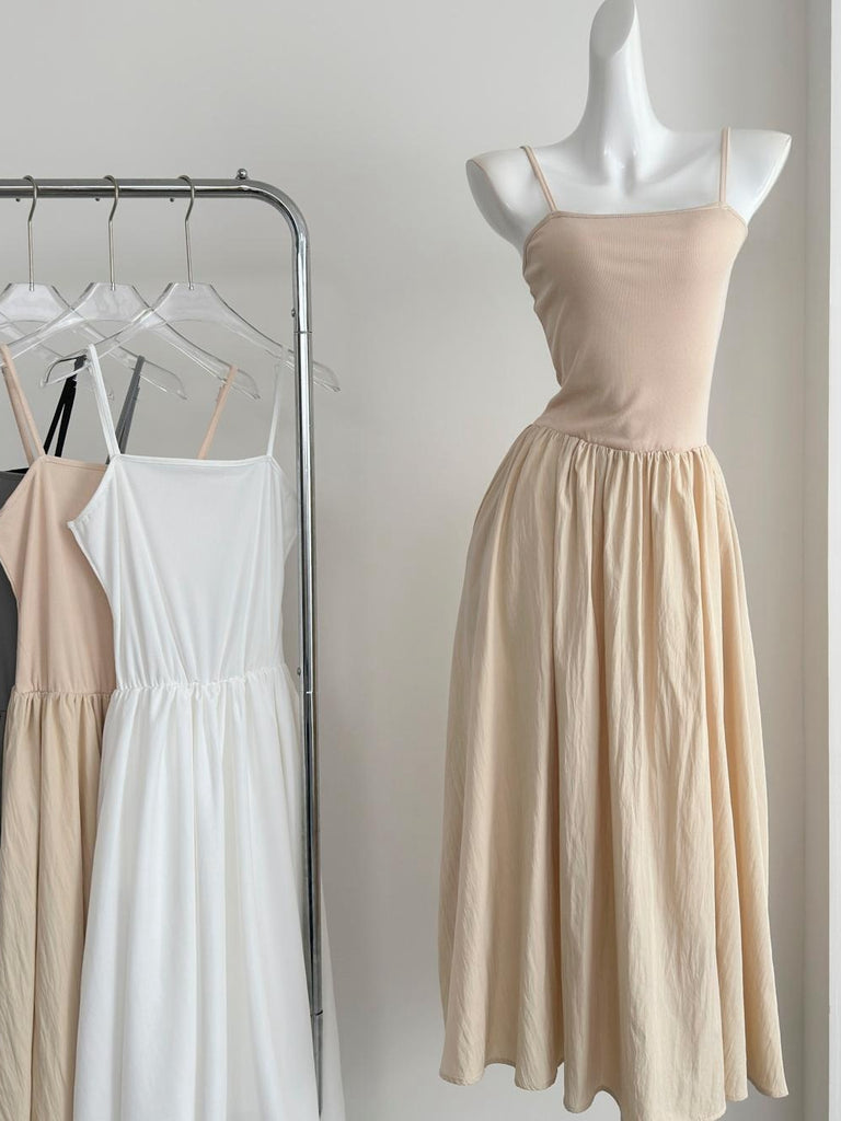 Flowy Skirt Minimalist Beige Spaghetti Strap Dress