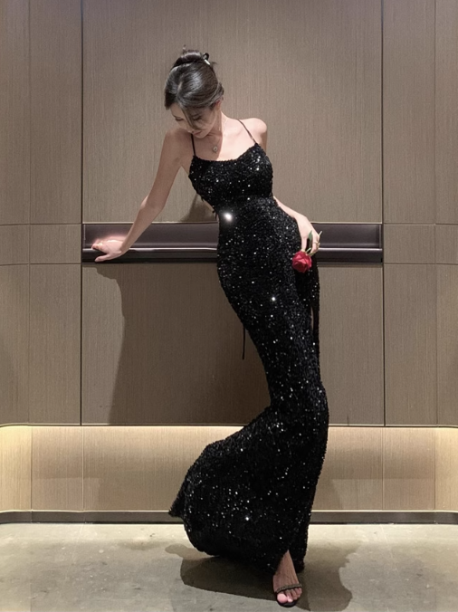 Glamorous Black Sequin Spaghetti Strap Mermaid Evening Dress