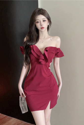 Glamorous Burgundy Off - the - Shoulder Dress with Ruffled Detail