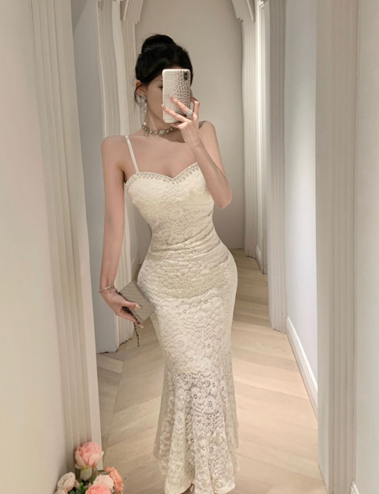 Graceful Beaded Strappy White Lace Maxi Cocktail Dress