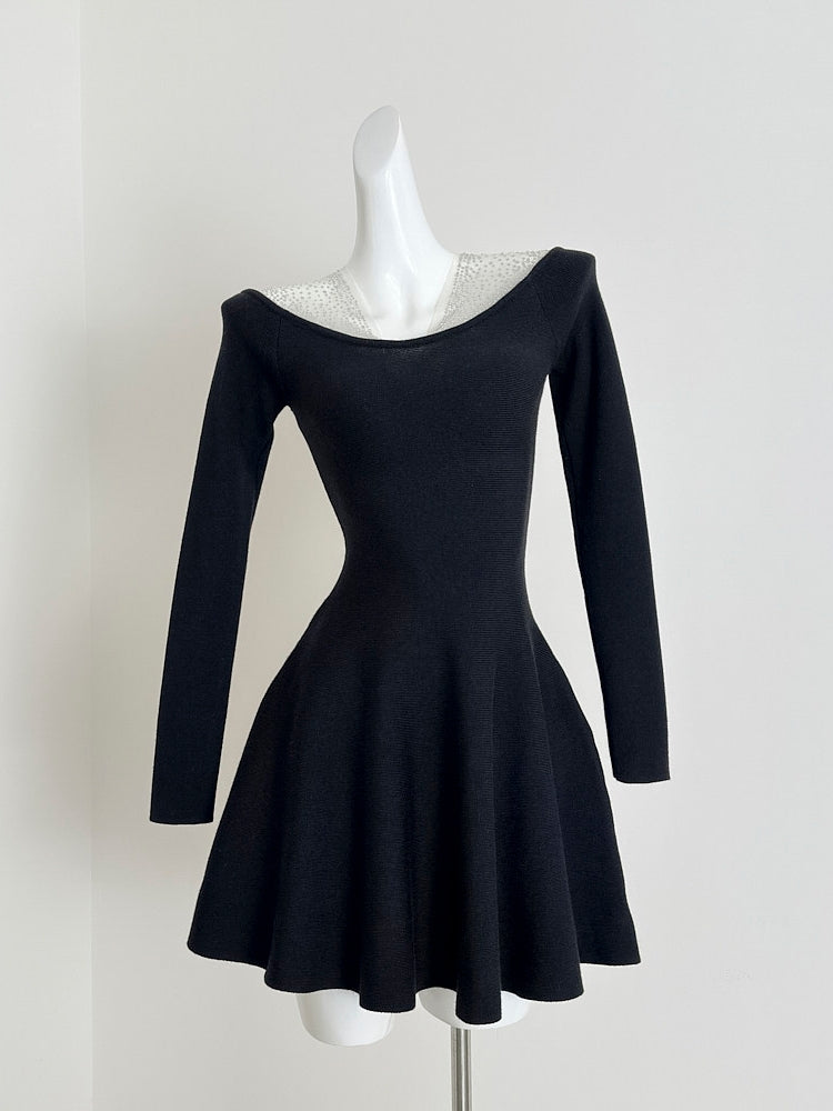 Sparkling Sheer Yoke Flared Hem Elegant Black Knit Mini Dress