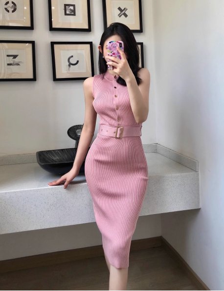 Stylish Button - front Pink Striped Bodycon Midi Dress