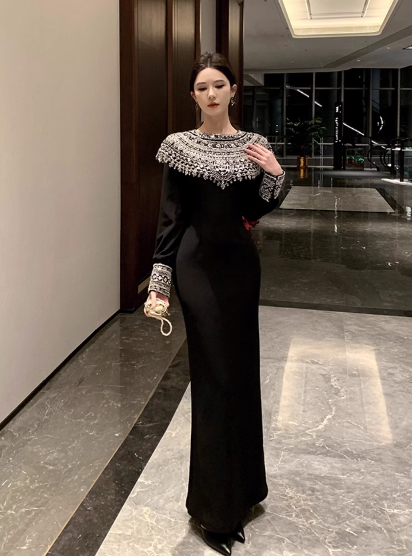 Stylish High - neck Black Dress with Crystal - trimmed Cuffs