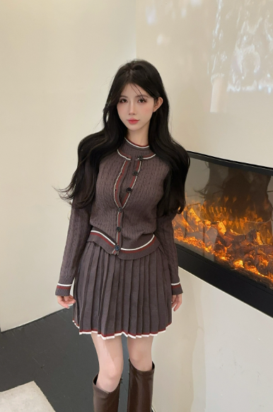 Stylish Knitted Cardigan and Pleated Skirt Set in Taupe
