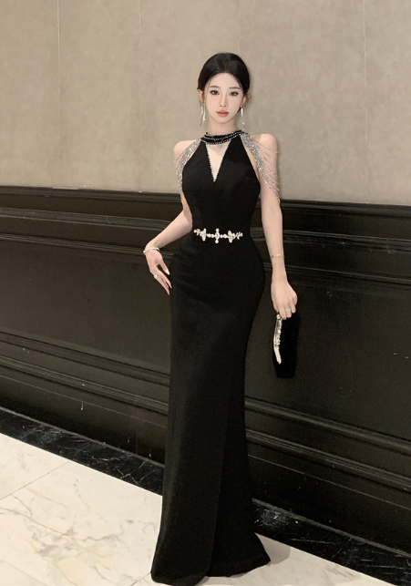 Stylish Sleeveless Black Dress with Sparkling Belt and Cut - out Neck