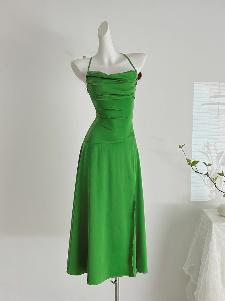 Elegant Green Ruched Bodice Halter Maxi Dress