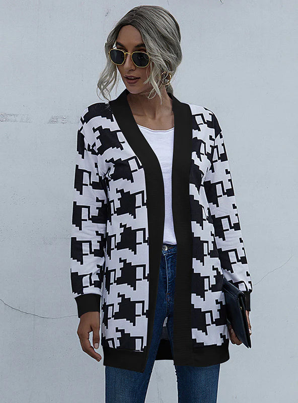 HOUNDSTOOTH PRINT LONG SLEEVE SWEATER COAT