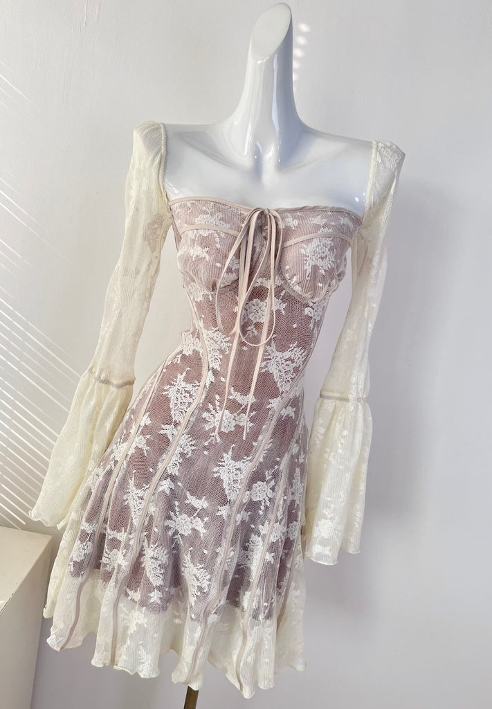 Aiming to captivate, this dress combines the classic allure of lace with the luxurious feel of velvet, set in a stunning mauve hue that appeals to modern fashion sensibilities. The body-hugging silhouette is balanced by the voluminous sleeves and the flared skirt, which together create a striking figure. The lace details are not merely decorative but are strategically placed to enhance the overall design and provide transparency in just the right places. This dress is not just a piece of clothing but a statement of style and sophistication, designed to make the wearer stand out at any event.