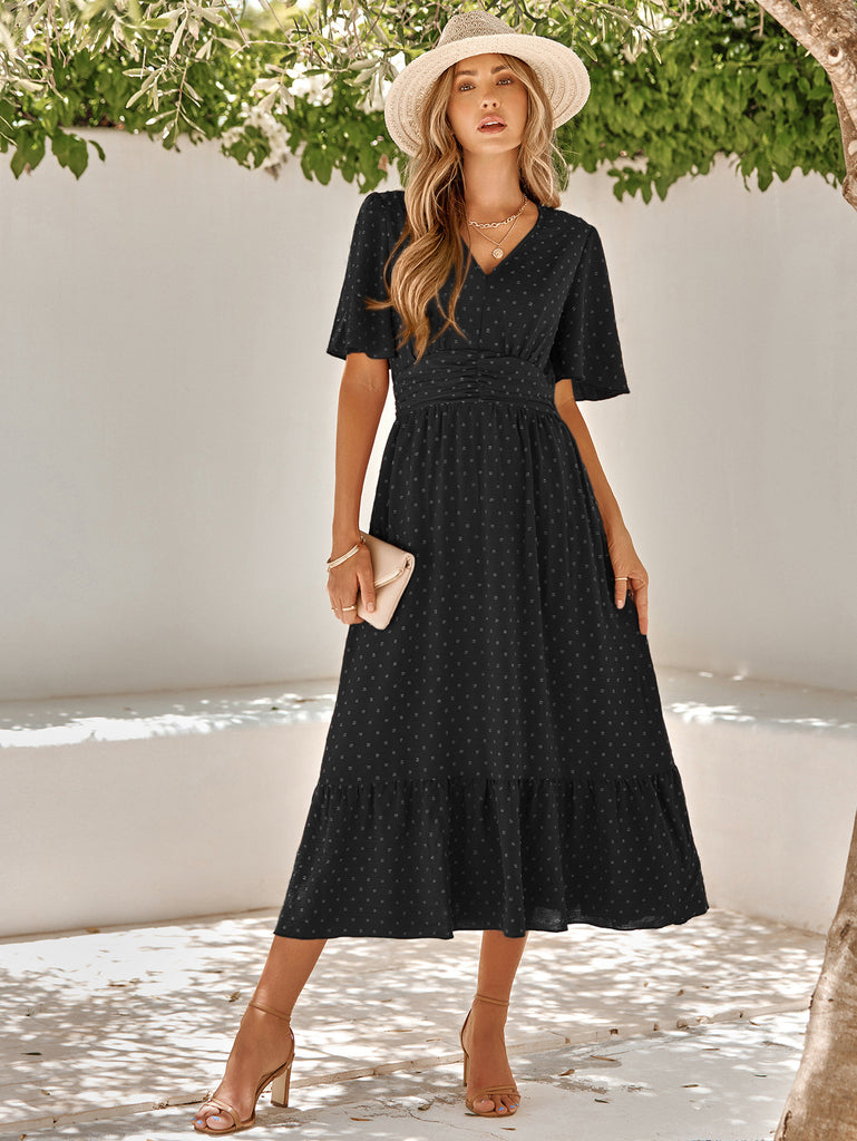 Adorn yourself in this charming cream dress, a perfect blend of style and comfort. The elegant V-neckline and flutter sleeves add a delicate touch, while the cinched waist with detailed ruching accentuates your silhouette beautifully. The high-low hemline with a ruffle detail provides a whimsical flair, making it ideal for both formal and casual settings. Crafted from a soft, breathable fabric, this dress ensures maximum comfort throughout the day. The textured pattern adds a sophisticated element to the overall look, making it stand out. Style it with a chic hat and statement accessories for a refined daytime ensemble or dress it up with heels and a clutch for an evening affair. This versatile dress is a must-have for anyone looking to add a touch of elegance to their wardrobe.