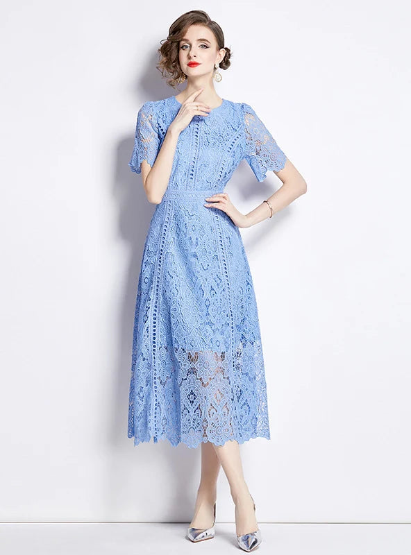 RETRO ROUND NECK LOTUS LEAF SLEEVE LACE DRESS
