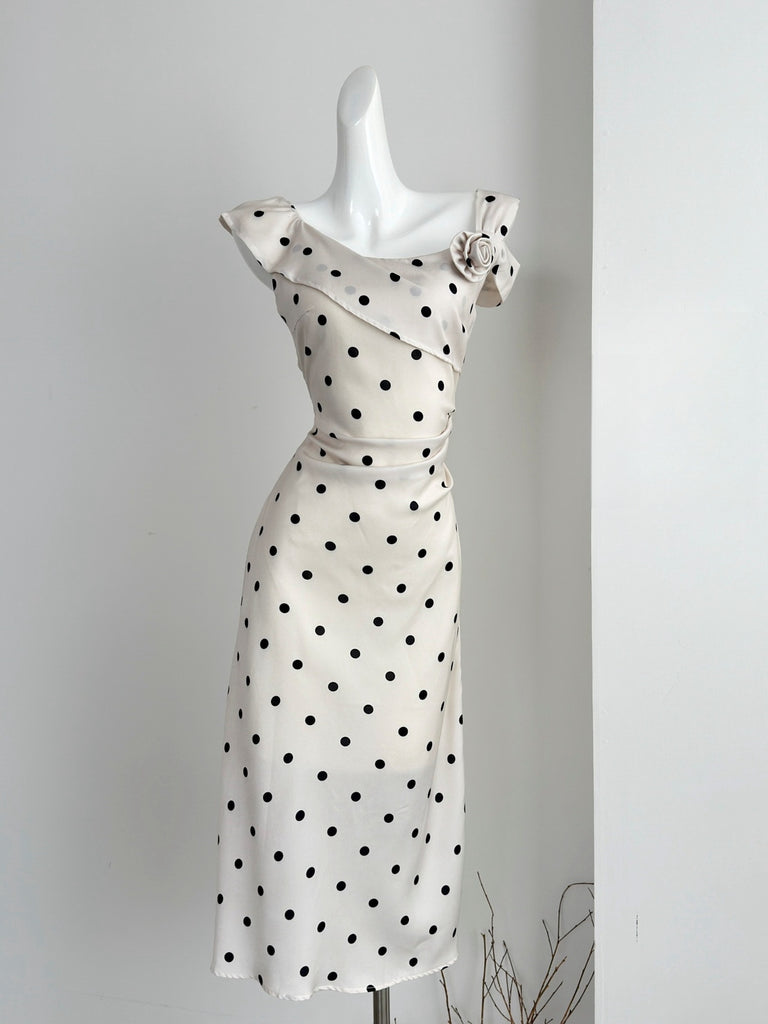 Asymmetric Ruffled Cream Polka Dot Midi Dress