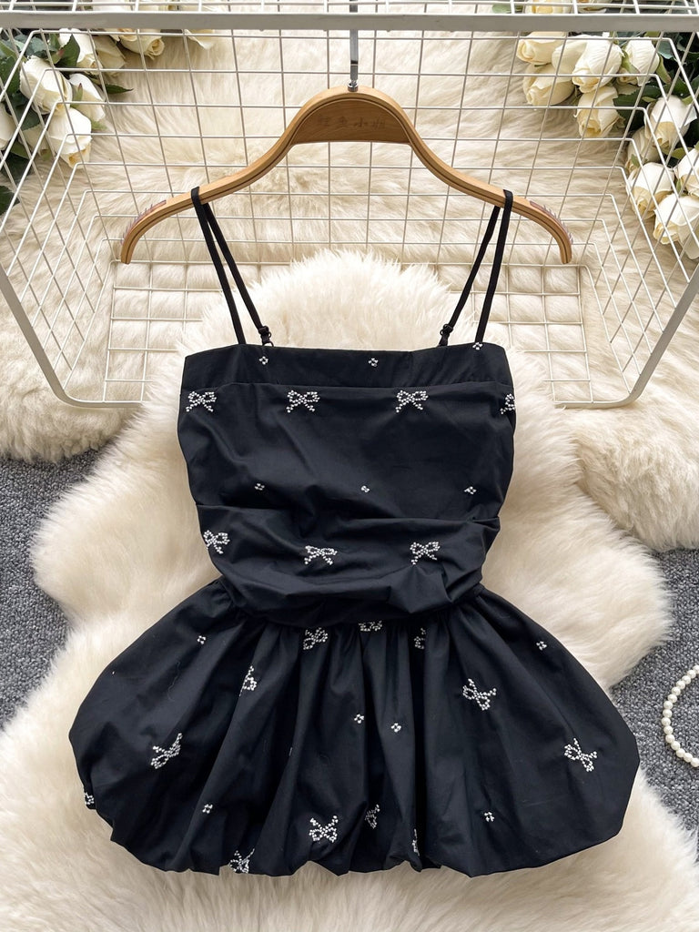 Previous NextFabulous detailing meets elegant design in this chic black dress. The delicate white bow patterns are intricately embroidered, adding a layer of sophistication and charm. Thin shoulder straps enhance the dress's graceful silhouette, while the fitted bodice flatters the figure effortlessly. The flared skirt introduces a playful yet refined aesthetic,...