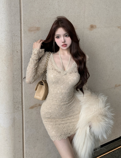 Elegant Long - Sleeve Beige Lace Bodycon Mini Dress
