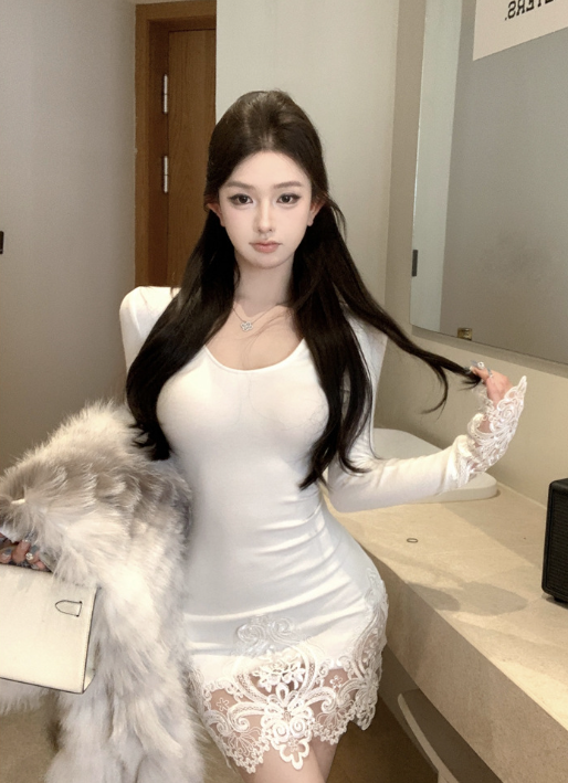 Elegant Long - sleeve White Bodycon Dress with Lace Details