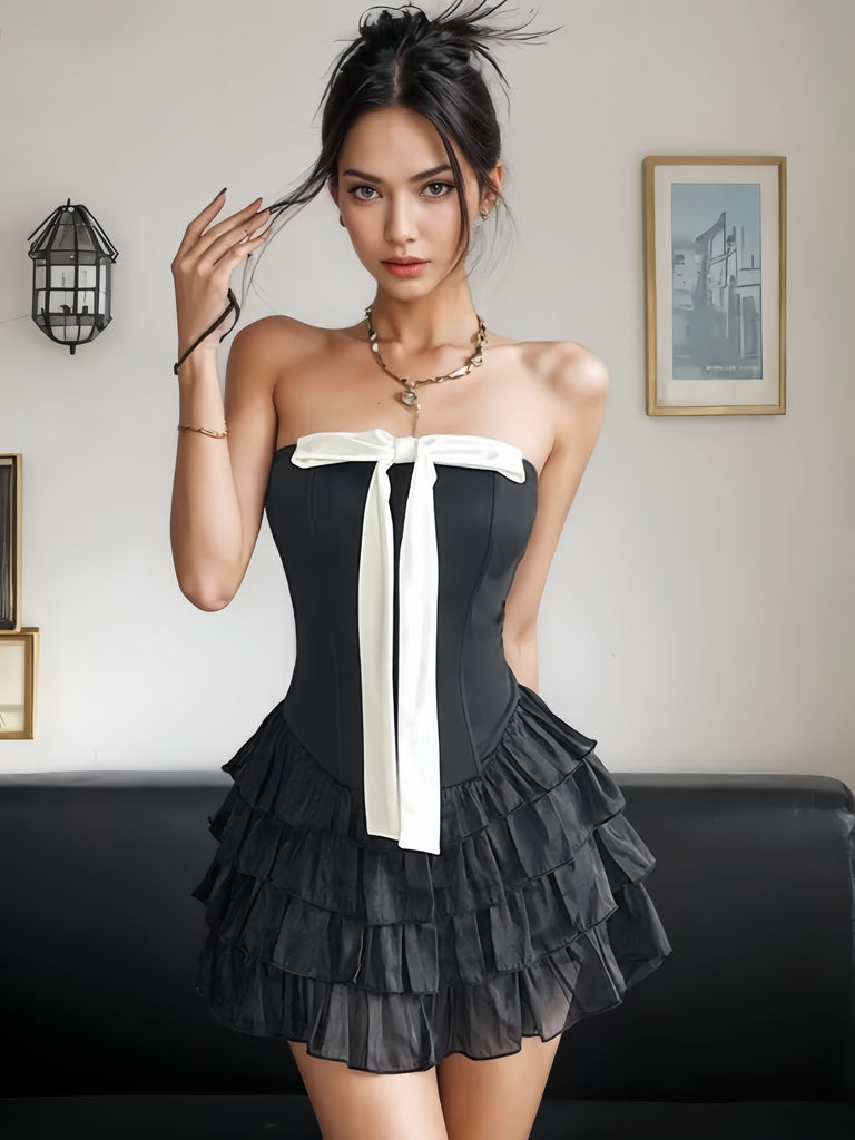 Elegant White Bow Strapless Black Mini Dress