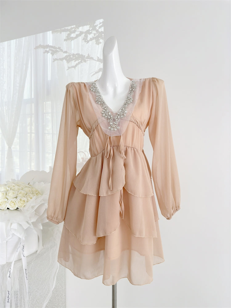Embellished Sheer Long Sleeves Tiered Beige Dress
