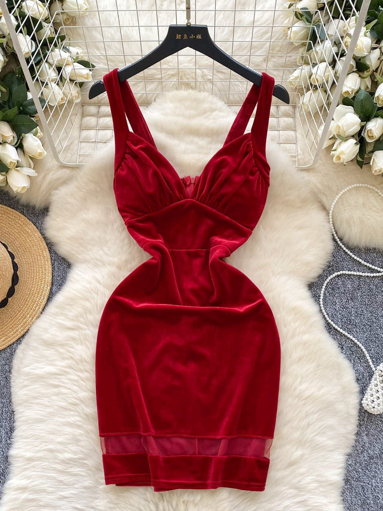 Mesh Wide Straps Red Velvet Bodycon Dress