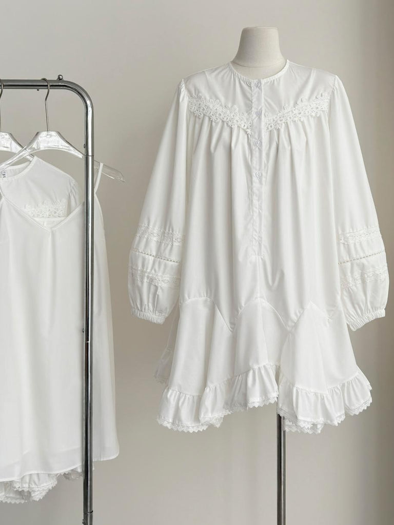 Ruffled Hem Lace White Long Sleeve Dress