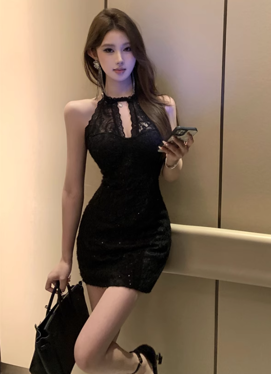 Stylish Halter Neck Black Lace Sequin Mini Dress