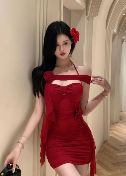 Stylish Halter Neck Red Dress with Floral Decorations