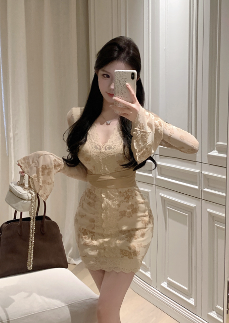 Stylish Long - sleeve Cream Floral Lace Bodycon Mini Dress