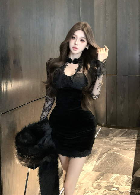 Stylish Mandarin - collar Blush Lace and Velvet Mini Dress