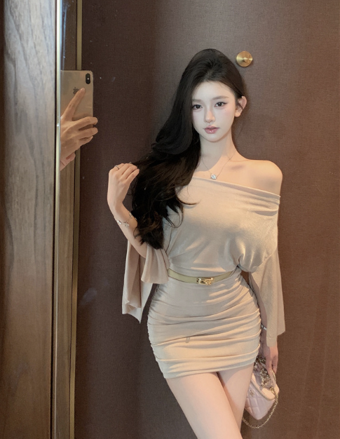 Stylish Off - Shoulder Beige Dress with Flared Sleeves and Belt