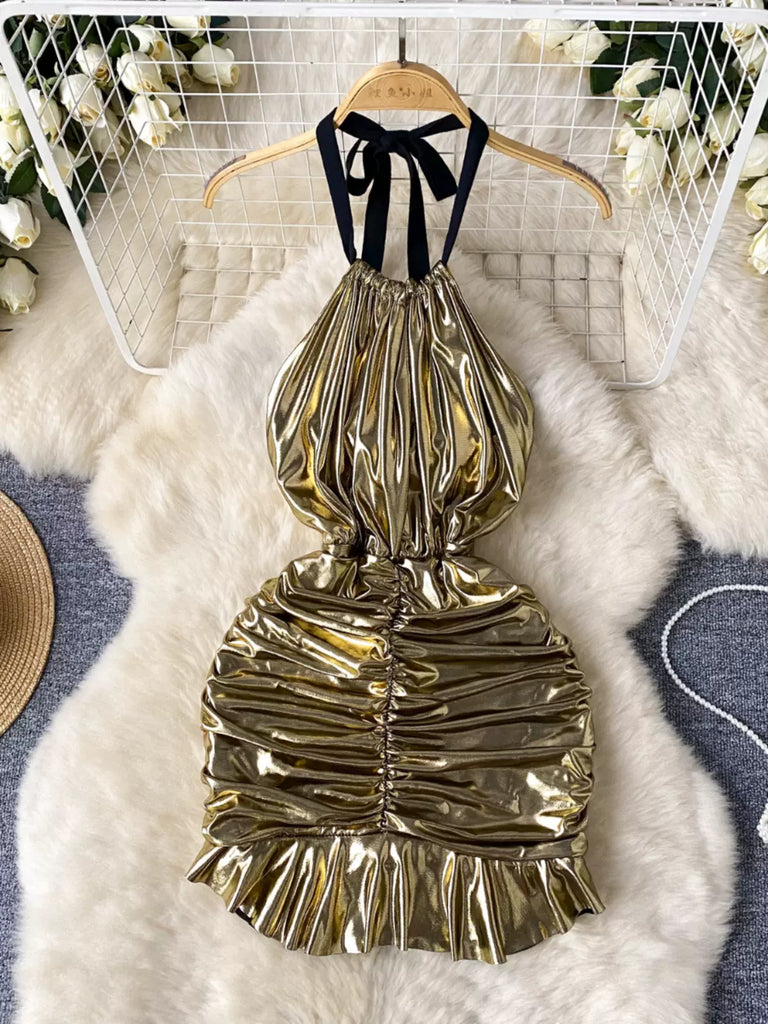 Turn heads with this metallic gold bubble dress! The daring halter neck and sleek black ribbon combine to create a bold statement piece. Fashioned from a lustrous gold fabric, this dress captures the light and eyes of all around you. Its gathered waist and voluminous bubble hem give it a playful yet couture feel, ideal for high-fashion parties or when you simply want to stand out. The dress is a perfect balance of avant-garde style and classic elegance.