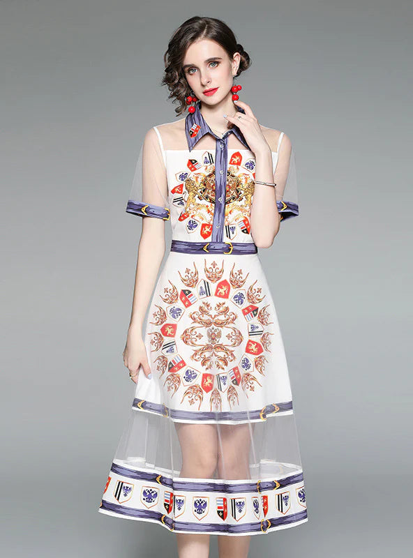 STITCHING MESH LAPEL SHORT SLEEVE PRINTED FAKE TWO-PIECE DRESS