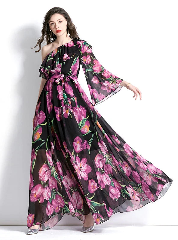 Hibiscus blooms come to life on this enchanting off-shoulder maxi dress, where rich shades of pink are set against a deep black backdrop. The sheer fabric billows gracefully, creating a silhouette that is both striking and whimsical. A tied waist accentuates the figure, while the flowing sleeves add a touch of drama. This dress is a statement piece, perfect for those evenings where elegance and impact are desired in equal measure.