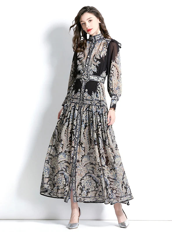 Feel like royalty in this exquisite dress! The elaborate baroque print, detailed with luxurious paisleys and florals, is set against a sheer black backdrop, making the pattern truly pop. The high neckline and cinched waist create a silhouette that is both regal and refined. With sheer sleeves adding a touch of modern sophistication, this dress is perfect for those who command attention with their style. It's a piece that transitions effortlessly from a high-profile meeting to an upscale evening event.