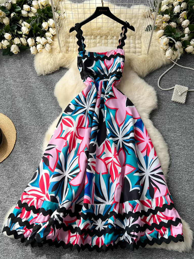 Black Ruffle Straps Vibrant Tropical Print Maxi Dress