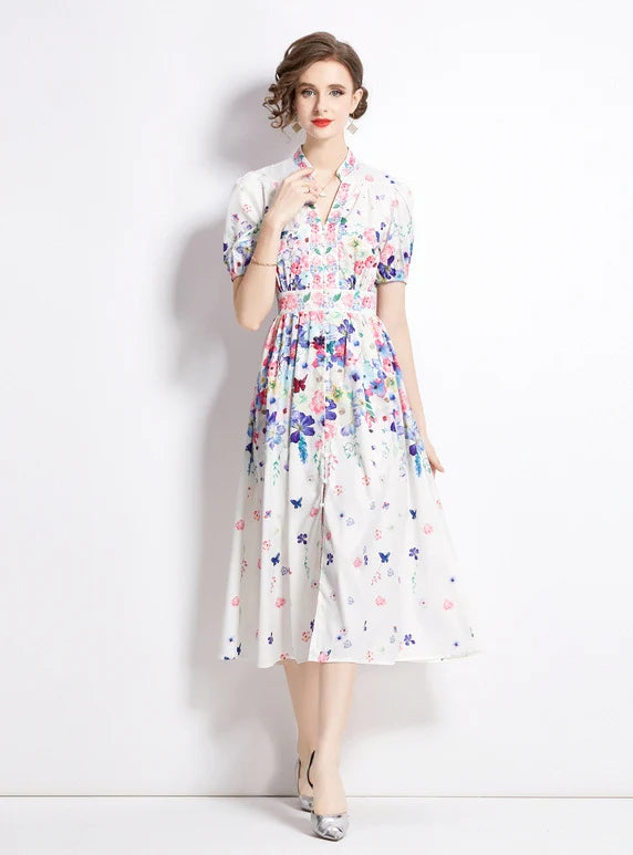 FASHION PRINTED V-NECK SHORT-SLEEVED SLIM DRESS